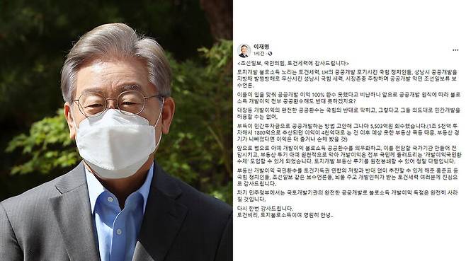이어 사업 추진 당시를 돌이키며 "개발이익의 완전한 공공환수는 국민의힘 반대로 막히고, 그렇다고 그들 의도대로 민간 개발을 허용할 수는 없었다"며 "부득이 민간 투자금으로 공공개발하는 방법을 고안, 그나마 5천503억 원을 회수했다"고 강조했습니다.