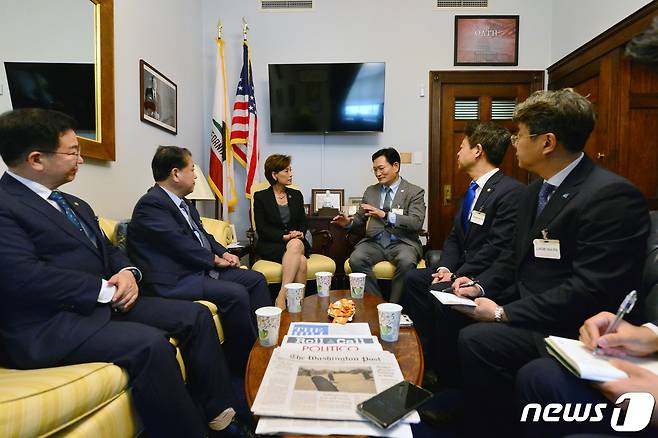 (서울=뉴스1) 구윤성 기자 = 송영길 대표를 비롯한 더불어민주당 방미단이 21일(현지시간) 미국 워싱턴 국회의사당에서 영 킴 미 의회 한국연구모임(CSGK) 공동의장과 만나 대화하고 있다. (더불어민주당 제공) 2021.9.22/뉴스1