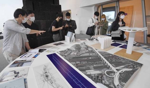 22일 서울 중구 동대문디자인플라자(DDP) 전시장에서 열린 '2021 서울도시건축비엔날레'에서 시민들이 2018년 8월14일 43명이 사망하고 제노바 시가 둘로 갈라진 비극이 발생한 현장인 '제노바 산 조르조 대교' 작품을 살펴보고 있다.