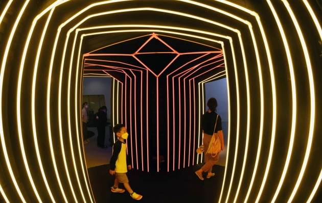 22일 서울 중구 동대문디자인플라자(DDP) 전시장에서 열린 ‘2021 서울도시건축비엔날레'에서 시민들이 지열 에너지를 활용한 시카고의 냉난방 시스템을 살펴보고 있다./김범준기자