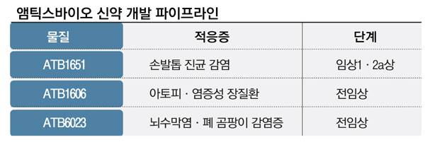 앰틱스바이오가 보유한 신약 후보 물질 가운데 개발 속도가 가장 빠른 것은 손발톱 진균 감염증 치료제(ATB1651)다. 현재 호주와 뉴질랜드에서 글로벌 임상1·2상을 신청한 상태로 다음달 말 승인이 나면 연내 약물 투여로 본임상을 개시할 예정이다.