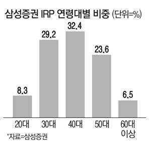 삼성증권 관계자는 "IRP는 퇴직을 앞둔 중·장년층을 위한 상품이라는 인식이 대부분이었지만 최근 30·40대 가입자가 눈에 띄게 증가하고 있다"면서 "절세 효과가 뛰어난 퇴직연금 상품이 부각되고 있다는 점도 이유로 꼽힌다"고 설명했다.
