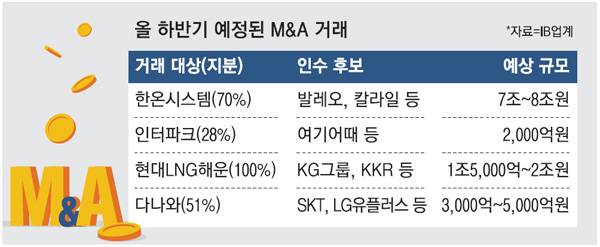 22일 투자은행(IB) 업계에 따르면 세계 공조시스템 시장점유율 2위인 한온시스템 매각을 위한 본입찰이 10월 이후 진행된다. 거래 대상은 한앤컴퍼니가 보유한 지분 50.5%와 한국타이어앤테크놀로지가 들고 있는 19.49% 등 70% 상당이다. 지난 2~3분기 선정한 적격인수후보군(숏리스트)에는 세계적 사모펀드(PEF) 운용사인 칼라일그룹과 베인캐피털, 독일 말레, 프랑스 발레오, 일본 니덱(일본전산) 등 해외 제조업체가 이름을 올렸다. M&A 시장에서는 한온시스템 본입찰이 10월 이후 진행될 것으로 보고 있다. 지분 70%에 대한 거래가는 7조~8조원에 달할 것으로 관측된다. 한국 최대 LNG 국적선 운영 규모를 자랑하는 현대LNG해운은 10월 본입찰을 진행할 것으로 알려졌다. 이 회사는 사업모델이 안정적인 것으로 평가받는다. 거래 대상은 PEF운용사 IMM프라이빗에쿼티(PE)와 IMM인베스트먼트가 보유한 지분 100%다. 지난달 예비입찰에는 KG그룹과 국제적 PEF 운용사 콜버그크래비스로버츠(KKR) 등이 참여했다. 매각가로는 1조5000억~2조원이 언급되고 있다. 다나와, 인터파크 등 1세대 이커머스 업체도 나란히 매물로 올라왔다. 가격비교 사이트를 운영하는 다나와는 매각을 위한 예비입찰을 앞두고 있다. 거래 대상은 성장현 이사회 의장 보유 지분 30.05%를 비롯한 51.35%다. 경영권 프리미엄을 합친 매각가는 3000억~5000억원 정도로 거론된다. SK텔레콤, 롯데, LG유플러스, KG그룹, PEF운용사 JKL파트너스 등이 인수 후보로 꼽힌다.