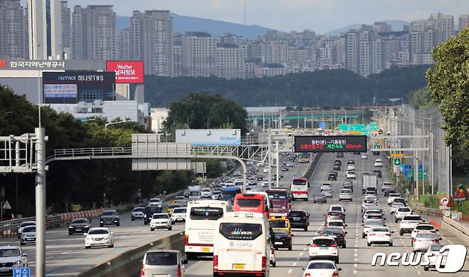 (오산=뉴스1) 김영운 기자 = 추석 연휴 마지막 날인 22일 오후 경기도 오산시 경부고속도로 오산 IC 인근 상하행선의 교통량이 많은 모습을 보이고 있다. 한국도로공사는 이날 전국에서 총 470만 대의 차량이 고속도로를 이용할 것으로 내다봤으며 귀경길 정체는 오후 4~5시쯤 절정에 달했다 밤 10~11시쯤 해소될 것으로 보인다. 2021.9.22/뉴스1