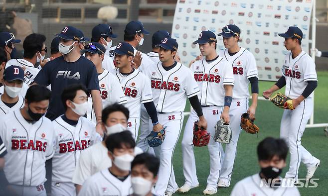 [서울=뉴시스] 고범준 기자 = 22일 오후 서울 송파구 잠실야구장에서 열린 2021 KBO리그 두산 베어스와 NC 다이노스의 경기, 8-0 승리한 두산 선수들이 김태형 감독과 하이파이브 하며 기뻐하고 있다. 2021.09.22. bjko@newsis.com