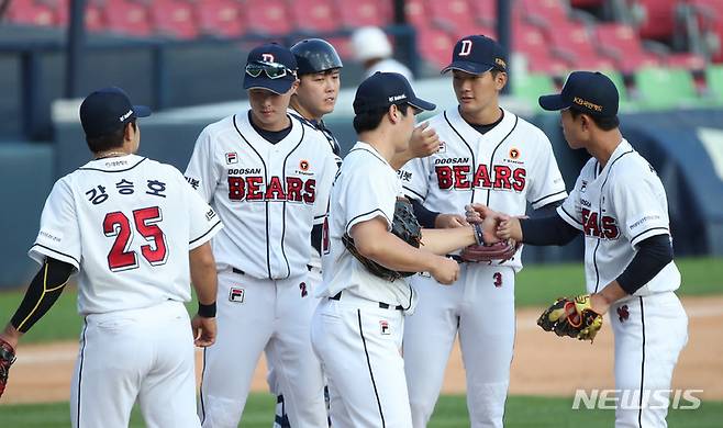 [서울=뉴시스] 고범준 기자 = 22일 오후 서울 송파구 잠실야구장에서 열린 2021 KBO리그 두산 베어스와 NC 다이노스의 경기, 8-0 승리한 두산 선수들이 기뻐하고 있다. 2021.09.22. bjko@newsis.com