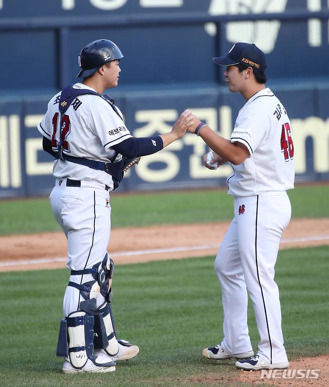[서울=뉴시스] 고범준 기자 = 22일 오후 서울 송파구 잠실야구장에서 열린 2021 KBO리그 두산 베어스와 NC 다이노스의 경기, 8-0 승리를 거둔 두산 최용제 포수와 김명신 투수가 기뻐하고 있다. 2021.09.22. bjko@newsis.com