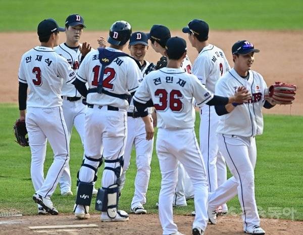 22일 서울 잠실야구장에서 열린 ‘2021 신한은행 SOL KBO리그’에서 두산 베어스와 NC 다이노스의 경기에서 두산이 NC에 8-0으로 승리를 거둔 뒤 선수들이 기쁨을 나누고 있다.