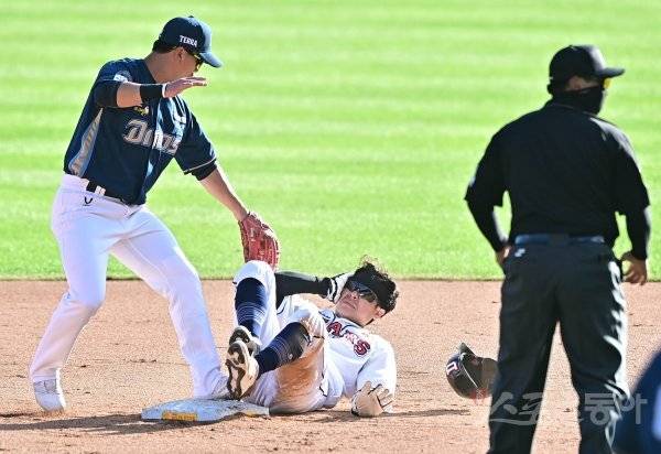 22일 서울 잠실야구장에서 열린 ‘2021 신한은행 SOL KBO리그’에서 두산 베어스와 NC 다이노스의 경기에서 7회말 무사 1루 두산의 내야 땅볼 때 1루주자 박세혁이 NC 2루수 정현의 송구 과정에서 충돌 후 고통을 호소하고 있다.