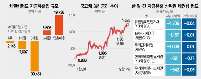 채권 금리에 수익률이 직결되는 상장지수펀드(ETF)도 상황은 비슷했다. ‘KBSTAR국고채3년선물인버스증권ETF’는 한 달 새 3,003억 원이 환매되며 설정액이 3,032억 원으로 반 토막 났고 ‘KODEX단기채권ETF(-1,543억 원)’ ‘KODEX10년국채선물인버스ETF(-199억 원)’ ‘KINDEX단기자금ETF(-100억 원)’ ‘KBSTAR금융채액티브ETF(-93억 원)’ 등도 줄줄이 자금이 빠져나갔다.
