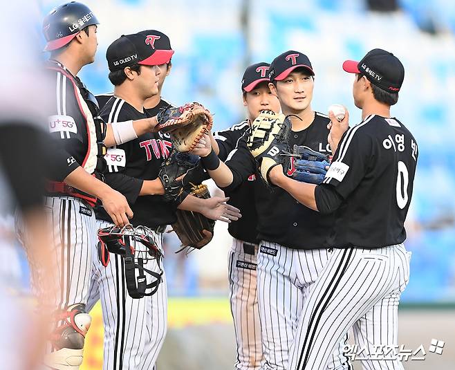 이날 경기에서 승리한 LG 선수들이 기뻐하고 있다.