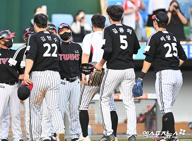 이날 경기에서 승리한 LG 류지현 감독이 선수들과 함께 기뻐하고 있다.