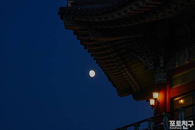 곧이어 보름을 앞둔 달이 떠오르고, 팔각정에 조명이 켜지면 새로운 풍경이 펼쳐집니다.