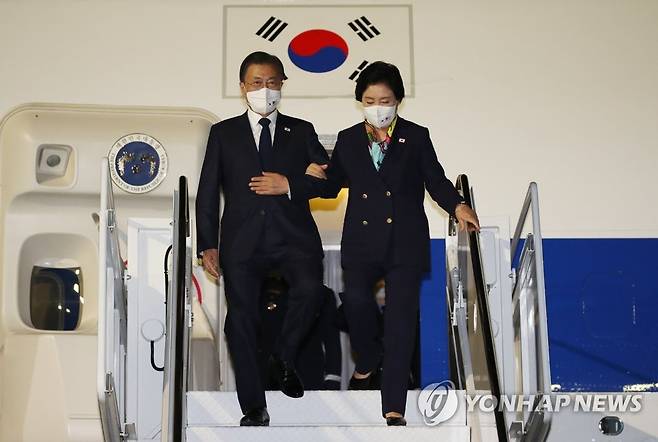 (호놀룰루=연합뉴스 ) 최재구 기자 = 한미 유해 상호 인수를 위해 미국 하와이를 방문한 문재인 대통령과 김정숙 여사가 21일(현지시각) 히캄 공군기지에 도착해 공군1호기에서 내리고 있다. 2021.9.22