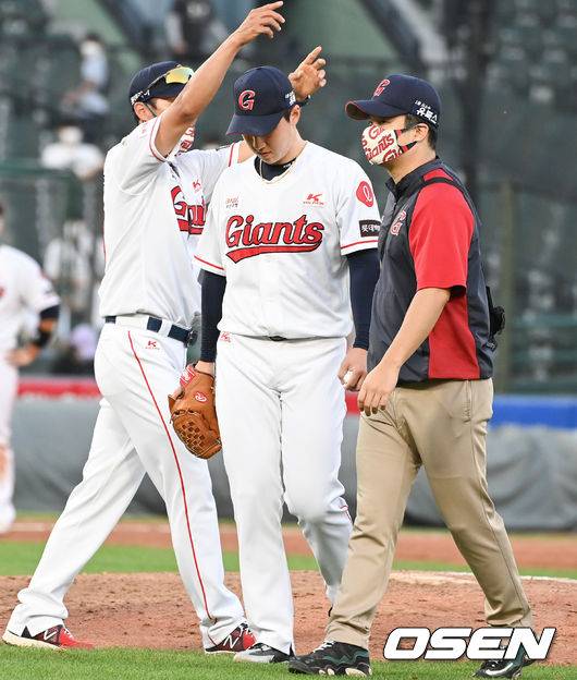 9회초 롯데 강윤구 투수가 몸 이상으로 교체되고 있다 2021.09.22 / soul1014@osen.co.kr