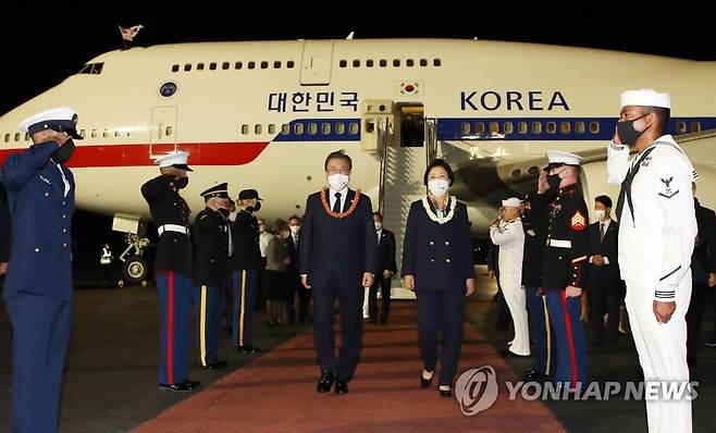 (호놀룰루=연합뉴스) 최재구 기자 =한미 유해 상호 인수를 위해 미국 하와이를 방문한 문재인 대통령과 김정숙 여사가 21일(현지시각) 하와이 히캄 공군기지에 도착, 공군1호기에서 내려 차량으로 이동하고 있다. 2021.9.22