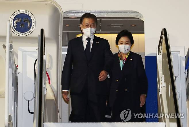 (호놀룰루=연합뉴스 ) 최재구 기자 = 한미 유해 상호 인수를 위해 미국 하와이를 방문한 문재인 대통령과 김정숙 여사가 21일(현지시각) 히캄 공군기지에 도착해 공군1호기에서 내리고 있다. 2021.9.22