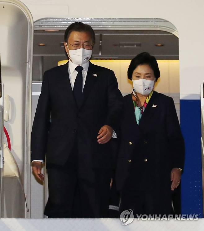 (호놀룰루=연합뉴스 ) 최재구 기자 = 한미 유해 상호 인수를 위해 미국 하와이를 방문한 문재인 대통령과 김정숙 여사가 21일(현지시각) 히캄 공군기지에 도착해 공군1호기에서 내리고 있다. 2021.9.22