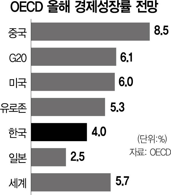 22일 경제협력개발기구(OECD)의 ‘중간 경제 전망’에 따르면 OECD는 올해 한국 경제성장률을 4.0%로 예상했다. 4개월 전 발표한 전망치(3.8%)보다 0.2%포인트 높인 수치다. 반면 세계 경제성장률은 기존 전망치보다 0.1%포인트 낮춘 5.7%로 제시했다. 주요 20개국(G20)의 성장률도 6.1%로 기존 대비 0.2%포인트 하향 조정됐다.