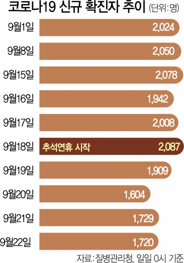 중앙방역대책본부(중대본)는 22일 0시 기준 코로나19 일일 신규 확진자가 1,720명으로 집계됐다고 밝혔다. 이틀 연속 1,700명대다. 주중 2,000명을 넘는 최근 확진자 발생 추이를 감안하면 규모는 줄었지만 추석 연휴 검사 건수가 적어진 영향이 반영된 결과여서 확산세가 꺾였다고 보기는 어렵다.