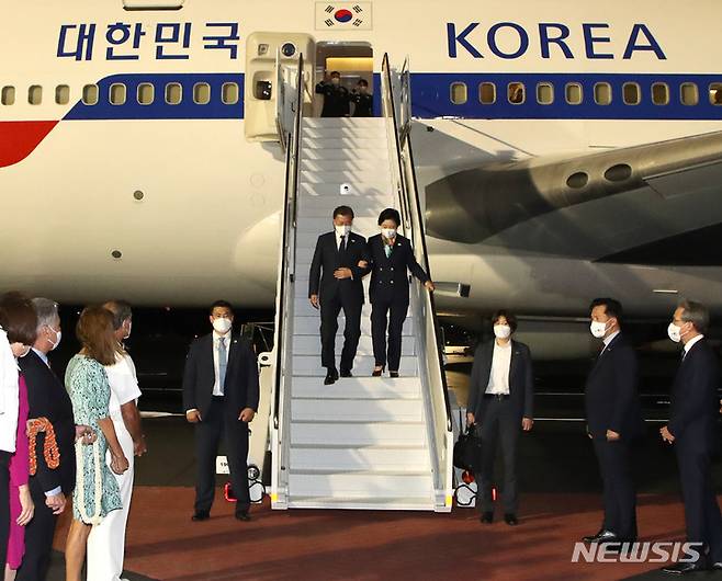 [호놀룰루=뉴시스] 김진아 기자 = 한미 유해 상호 인수를 위해 미국 하와이를 방문한 문재인 대통령과 김정숙 여사가 21일(현지시간) 히캄 공군기지에 도착해 공군1호기에서 내리고 있다. 2021.09.22. bluesoda@newsis.com