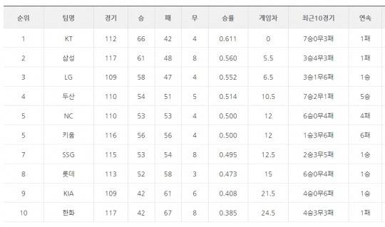 [프로야구 22일 팀 순위]혼돈의 중위권, 질주하는 두산은 어디까지?~NC와 키움은 공동 5위에~KIA와 롯데는 1위 k, 2위 삼성에 전날 패배 설욕