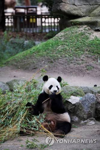 epa09481218 A panda bear eats in its enclosure at Madrid zoo in Madrid, Spain, 22 September 2021. Two giant panda cubs were born last 06 September at the Spanish zoo. EPA/DAVID FERNANDEZ