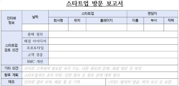 이렇게 해서 관심 스타트업 방문 결과까지 정리해 보았는데, 관심 스타트업 방문 결과 마무리를 위해 해야 할 일이 한가지 남아있다. 바로 방문 스타트업에 대한 감사 메일과 함께 정리한 스타트업 방문 보고서를 보내는 일이다. 그렇게 함으로써 그 스타트업에서 여러분을 다시 한번 기억하게 될 것이며, 많은 도움이 되었다는 사실에 보람을 느끼며, 좋은 관계를 유지할 가능성이 높아지게 된다. 뿐만 아니라 다음에 그 스타트업에 연락할 수 있는 또다른 스타트업 활동가에게도 긍정적인 영향을 줄 수도 있다.