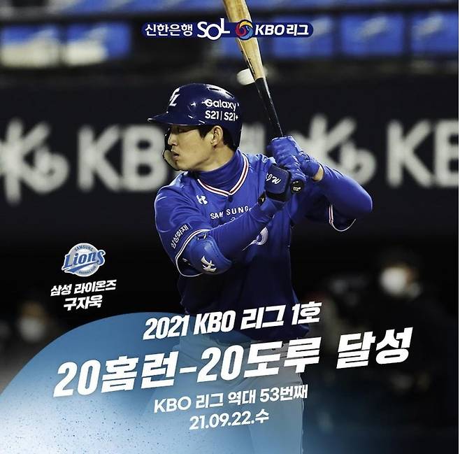(서울=연합뉴스) 삼성 구자욱은 22일 부산에서 열린 롯데와의 경기 7회 우중간 스탠드에 떨어지는 솔로 홈런을 날려 시즌 20번째 홈런을 채우고 역대 53번째이자 올해 1호 20홈런-20도루의 주인공이 됐다. 2021.9.22 [KBO 인스타그램 캡처. 재판매 및 DB 금지]