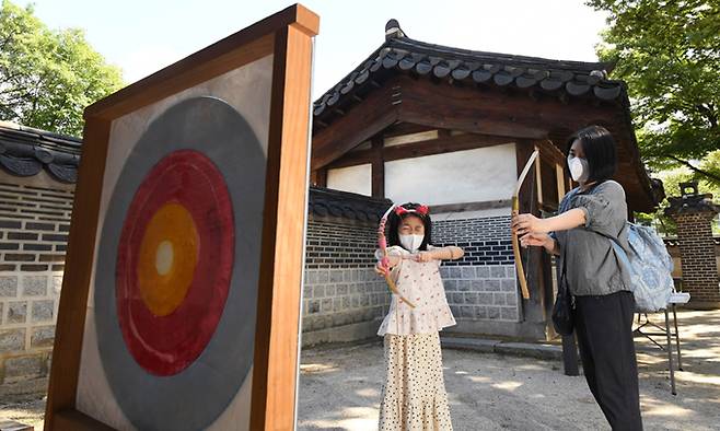추석 연휴 마지막 날인 22일 서울 종로구 운현궁을 찾은 시민들이 활쏘기 체험을 하고 있다.