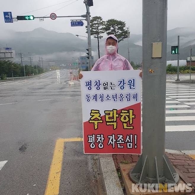 [평창=쿠키뉴스] 박하림 기자 =이창열 강원 평창군 청년연합회장이 추석 당일인 21일 강원 평창군 평창읍 일대에서 '평창 없는 동계청소년올림픽대회 규탄'의 내용을 담은 피켓을 들고 1인 시위를 하고 있다. 이 회장은 "강원동계청소년올림픽 조직위의 주사무소 평창 이전과 개・폐회식 평창돔 개최를 촉구한다"면서 "청년 리더로서 지역 현안 해결과 발전을 위해 열정을 불태우겠다"고 밝혔다. 지난 6월14일부터 시작한 1인 시위는 이날 100일을 달성했다.
