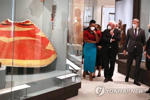 epa09481541 Nigerian writer Chimamanda Ngozi Adichie (3-R), German President Frank-Walter Steinmeier (2-R), and other officials join a walkabaout during the ceremonial opening of the eexhibitions at the Ethnological Museum and the Museum for Asian Art of the State Museums of Berlin at the Humboldt Forum Museum in Berlin, Germany, 22 September 2021. EPA/Christian Marquardt / POOL