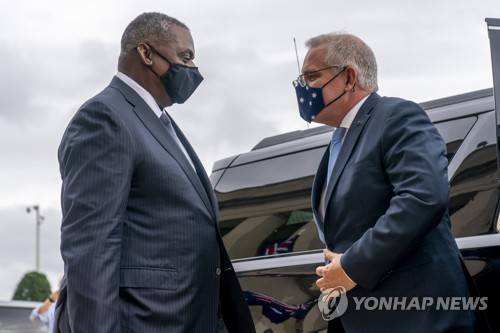 Secretary of Defense Lloyd Austin greets Australian Prime Minister Scott Morrison during an honor cordon upon his arrival at the Pentagon in Washington, Wednesday, Sept. 22, 2021. (AP Photo/Andrew Harnik)