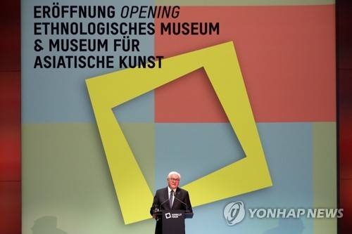 epa09481538 German President Frank-Walter Steinmeier addresses the participants of the ceremonial opening of the exhibitions at the Ethnological Museum and the Museum for Asian Art of the State Museums of Berlin at the Humboldt Forum Museum in Berlin, Germany, 22 September 2021. EPA/Christian Marquardt / POOL