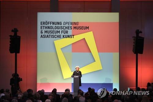 epa09481540 Federal Government Commissioner for Culture and the Media, Monika Gruetters (at rostrum),addresses the participants of the ceremonial opening of the exhibitions at the Ethnological Museum and the Museum for Asian Art of the State Museums of Berlin at the Humboldt Forum Museum in Berlin, Germany, 22 September 2021. EPA/Christian Marquardt / POOL