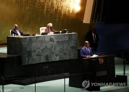 Republic of Congo's President Felix Tshisekedi speaks at a High-level meeting commemorate the twentieth anniversary of the adoption of the Durban Declaration during the 76th Session of the U.N. General Assembly at United Nations headquarters in New York, on Wednesday, Sept. 22, 2021. (John Angelillo/Pool Photo via AP) POOL PHOTO; MANDATORY CREDIT