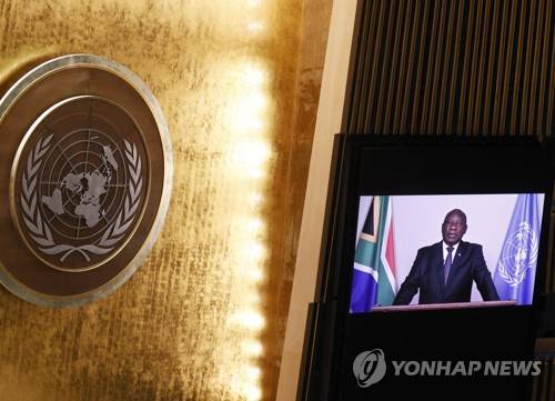 epa09481563 President of the Republic of South Africa Mr. Matamela Cyril Ramaphosa delivers a pre-recorded statement at a High-level meeting to commemorate the twentieth anniversary of the adoption of the Durban Declaration and Programme of Action 'Reparations, racial justice and equality for people of African descent' as part of the UN General Assembly 76th session General Debate in the UN General Assembly Hall at the United Nations Headquarters, in New York City, USA, 22 September 2021. EPA/JOHN ANGELILLO / POOL