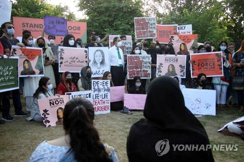 epa09481579 People hold placards during a protest for justice after the girl Noor Mukadam, was murdered on 21 September in Islamabad, Pakistan, 22 September 2021. Police arr?ested Zahir Jaffer, the suspect in the murder of former diplomat Shaukat Mukadam's daughter, Noor Muqadam, as people call for protection of women agai?nst rising violence. EPA/SOHAIL SHAHZAD