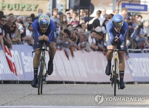 epa09481589 Italian team composed with Marta Cavalli, Elena Cecchini, Elisa Longo Borghini, Edoardo Affini, Filippo Ganna, Matteo Sobrero at the finish of the team time trial mixed relay at the 2021 Road Cycling World Championships in Bruges, Belgium, 22 September 2021. EPA/STEPHANIE LECOCQ
