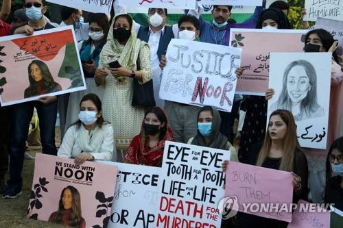 epa09481582 People hold placards during a protest for justice after the girl Noor Mukadam, was murdered on 21 September in Islamabad, Pakistan, 22 September 2021. Police arr?ested Zahir Jaffer, the suspect in the murder of former diplomat Shaukat Mukadam's daughter, Noor Muqadam, as people call for protection of women agai?nst rising violence. EPA/SOHAIL SHAHZAD