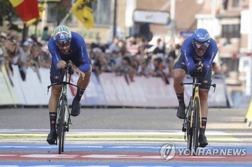 epa09481586 Italian team composed with Marta Cavalli, Elena Cecchini, Elisa Longo Borghini, Edoardo Affini, Filippo Ganna, Matteo Sobrero at the finish of the team time trial mixed relay at the 2021 Road Cycling World Championships in Bruges, Belgium, 22 September 2021. EPA/STEPHANIE LECOCQ
