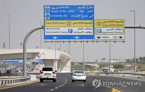 epa09481600 A traffic sign is referring to the site of EXPO 202 Dubai fair some days prior to the official opening in Gulf emirate of Dubai, United Arab Emirates, 22 September 2021. EXPO 2020 Dubai was supposed to open its doors to the visitors last October 2020, but had been postponed due to the COVID-19 pandemic until October 2021. EPA/ALI HAIDER