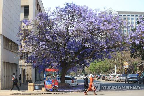 epa09481611 People walk past a blooming Jacaranda tree in Harare, Zimbabwe, 22 September 2021, a day after Zimbabwean President Emmerson Mnangagwa further extended the country's level two lockdown by two weeks. EPA/AARON UFUMELI