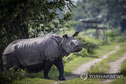 A one-horned rhinoceros crosses a road inside Kaziranga national park on the eve of the World Rhino Day in Gauhati, India, Tuesday, Sept. 21, 2021. Kaziranga is home to nearly 2,500 one-horned rhinos and is the world’s largest habitat for the rare animal. (AP Photo/Anupam Nath)