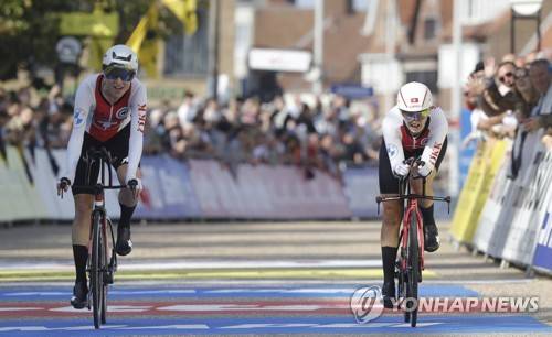 Nicole Koller, Marlen Reusser, Stefan Bissegger, Stefan Kung, Mauro Schmid at the finish of the team time trial mixed relay at the 2021 Road Cycling World Championships in Bruges, Belgium, 22 September 2021. EPA/STEPHANIE LECOCQ