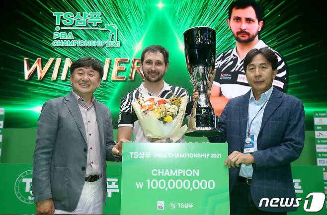 (서울=뉴스1) = 22일 고양시 소노캄고양에서 열린 프로당구 'TS샴푸 PBA-LPBA 챔피언십 2021' PBA 결승전에서 다비드 마르티네스(스페인, 크라운해태)가 응우옌 프엉린(베트남·NH농협카드)에게 4대2로 승리해 우승했다. 왼쪽부터 장상진 PBA부총재, 마르티네스, 장기영 TS트릴리온 대표. (PBA 투어 제공) 2021.9.22/뉴스1