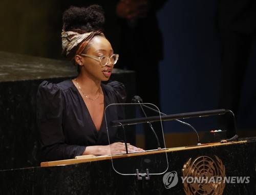 Founder of The Praxis Project Catherine Labiran speaks at a high-level meeting to commemorate the twentieth anniversary of the adoption of the Durban Declaration during the 76th Session of the U.N. General Assembly at United Nations headquarters in New York, on Wednesday, Sept. 22, 2021. John Angelillo/Pool Photo via AP) POOL PHOTO; MANDATORY CREDIT