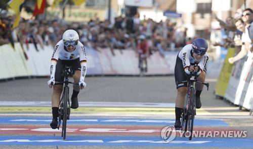 epa09481649 German team composed with Lisa Brennauer, Lisa Klein, Mieke Kroeger, Nikias Arndt, Tony Martin, Maximilian Richard Walscheid at the finish of the team time trial mixed relay at the 2021 Road Cycling World Championships in Bruges, Belgium, 22 September 2021. EPA/STEPHANIE LECOCQ