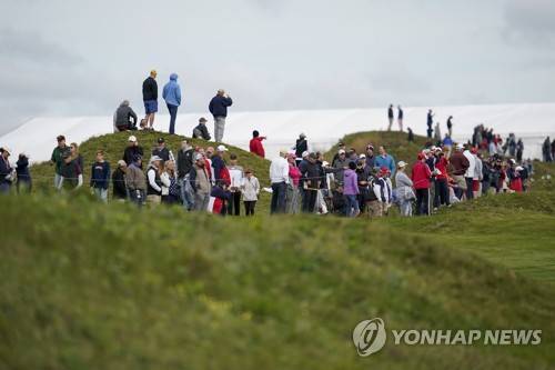 Fans line up to watch during a practice day at the Ryder Cup at the Whistling Straits Golf Course Wednesday, Sept. 22, 2021, in Sheboygan, Wis. (AP Photo/Ashley Landis)