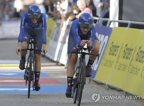 epa09481675 Italian team composed with Marta Cavalli, Elena Cecchini, Elisa Longo Borghini, Edoardo Affini, Filippo Ganna, Matteo Sobrero at the finish of the team time trial mixed relay at the 2021 Road Cycling World Championships in Bruges, Belgium, 22 September 2021. EPA/STEPHANIE LECOCQ